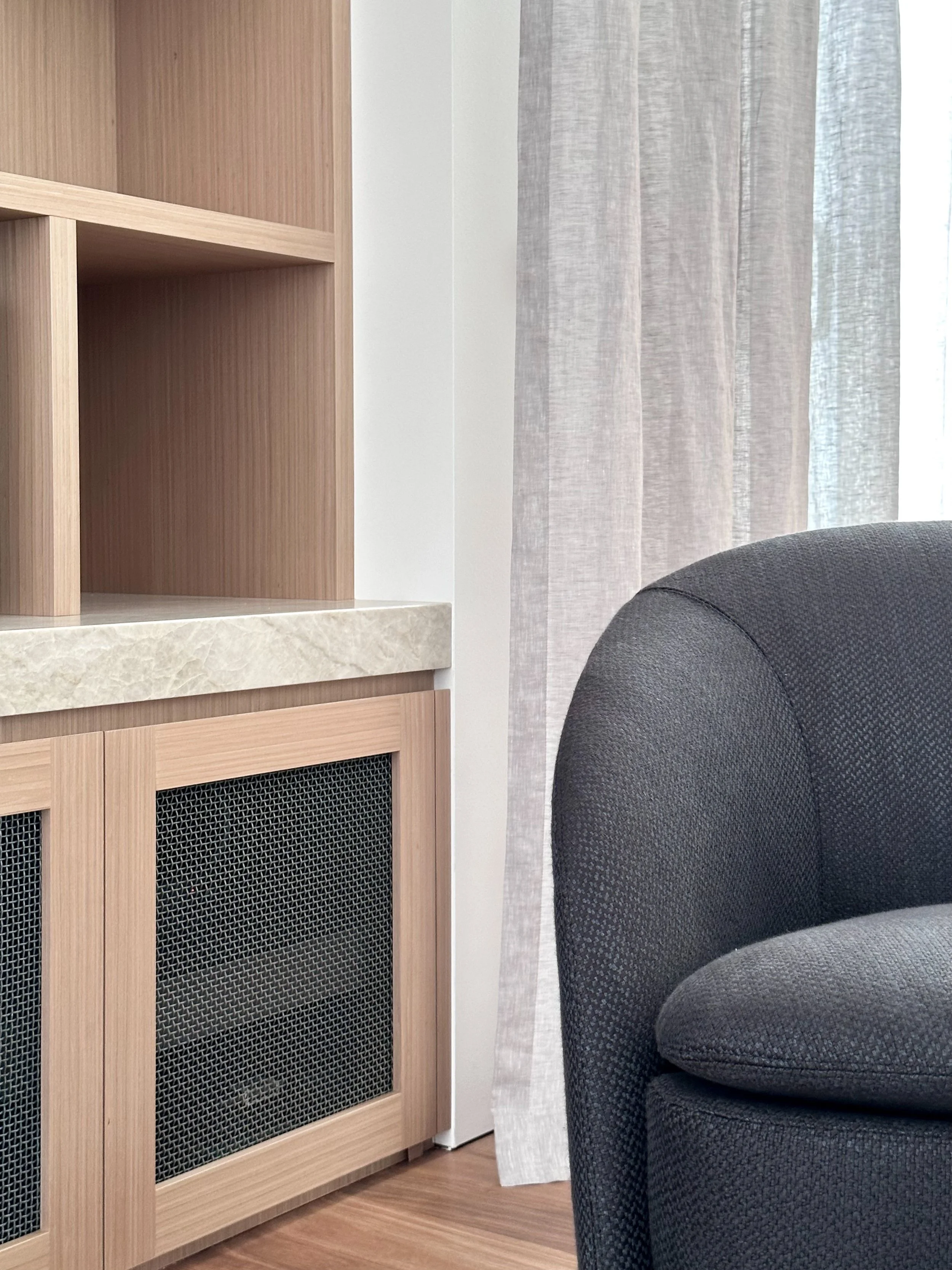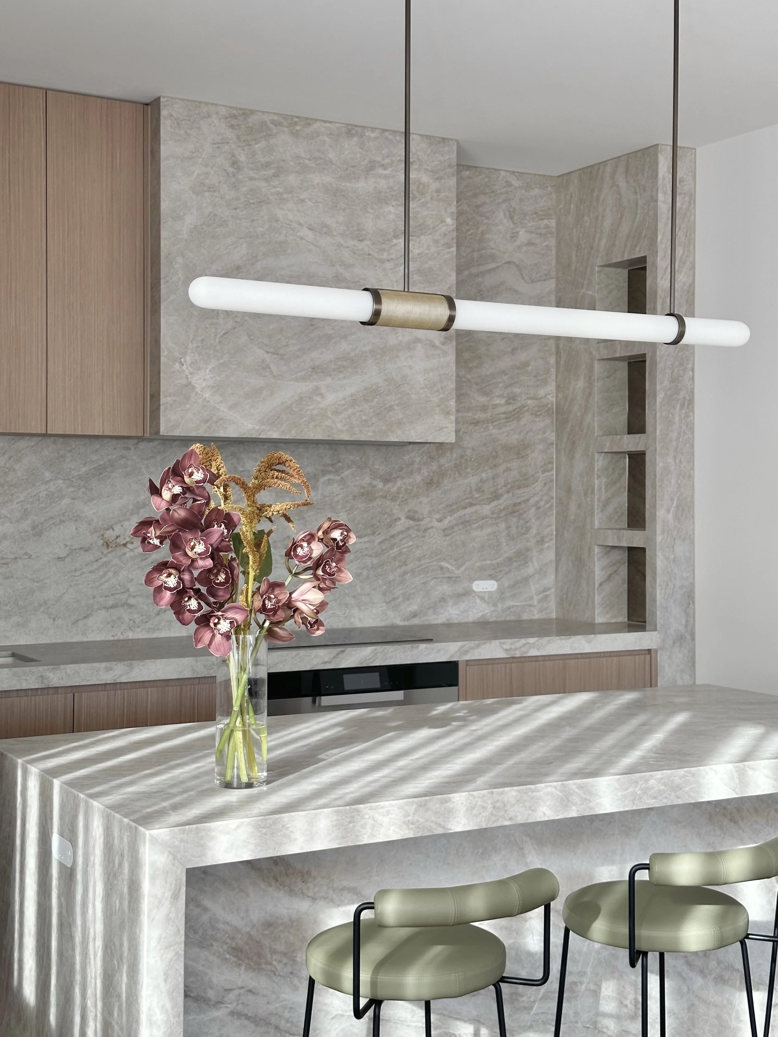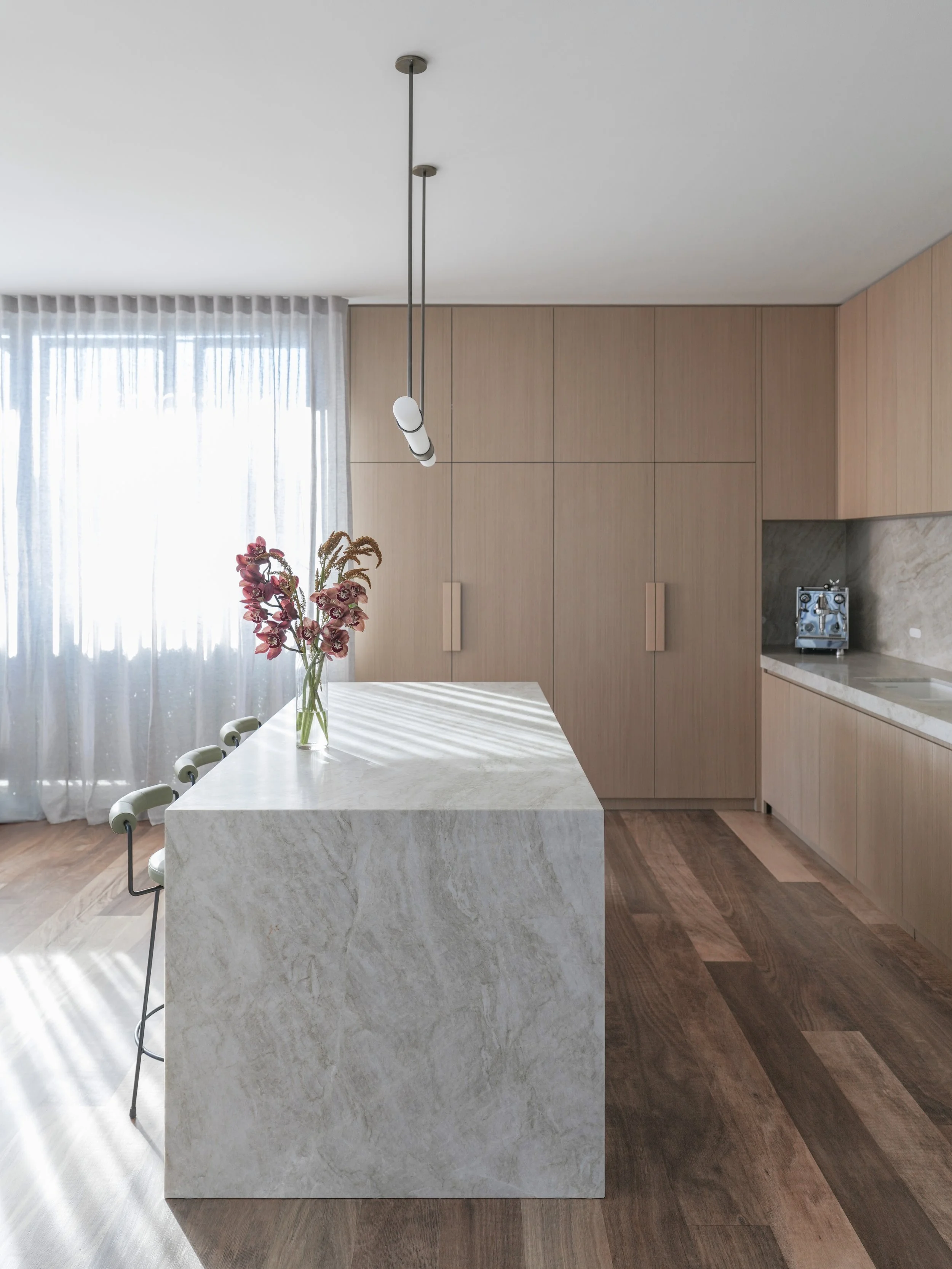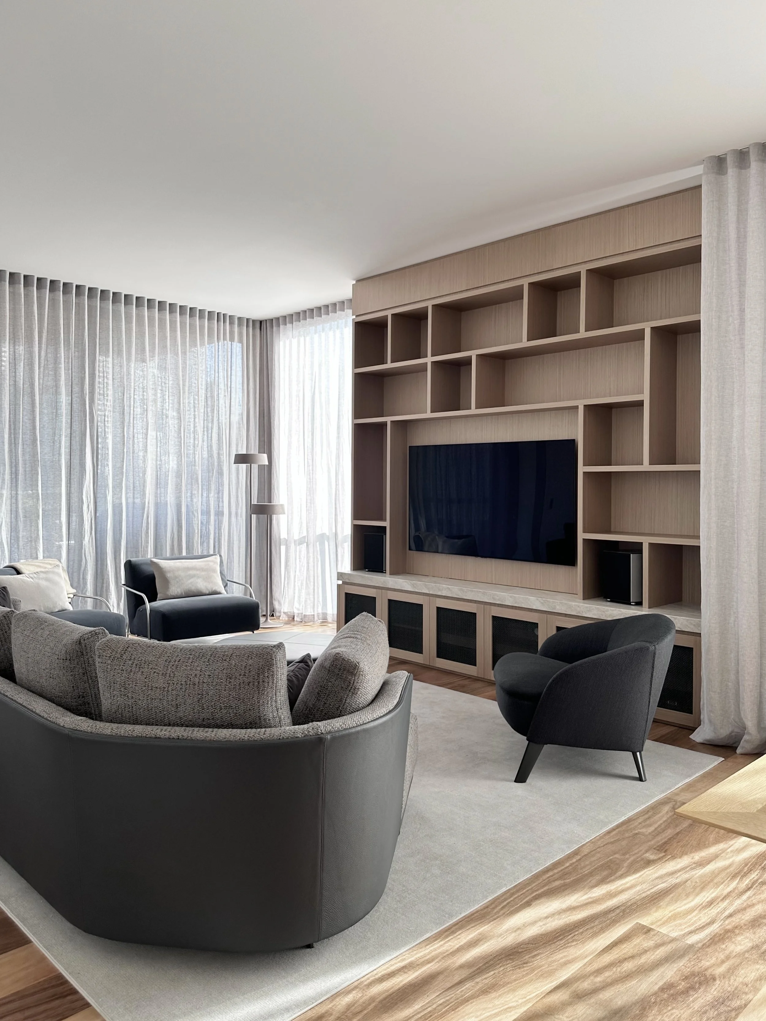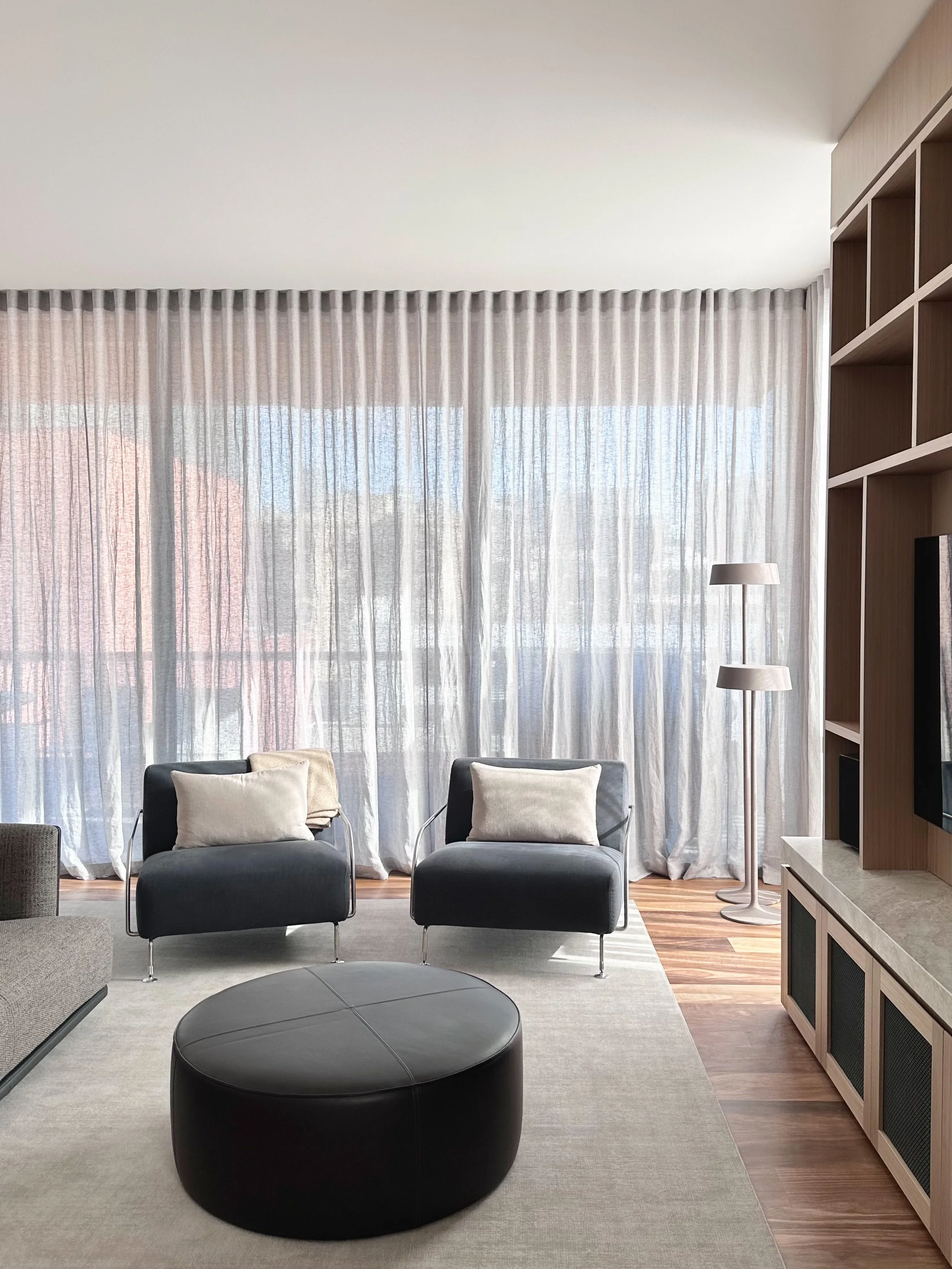 Commanding an entire floor within East Melbourne’s highly sought-after Jolimont pocket, this penthouse underwent a comprehensive interior reinvention. Stripped back to its foundational shell, our studio oversaw the complete interior architecture and final styling to transform the expansive residence into a sophisticated urban sanctuary. This sweeping internal transformation, anchored by meticulously designed custom cabinetry and luxurious ceiling-mounted sheer drapery framing panoramic city and parkland views, is elevated by our deeply considered approach to the interior styling. We custom-designed bespoke furniture and textural rugs, seamlessly layering them with meticulously selected statement lighting and fine artworks. Every element was thoughtfully curated to ensure the home reflects the prestige of its iconic location while offering a highly personalized, turnkey lifestyle for our clients.